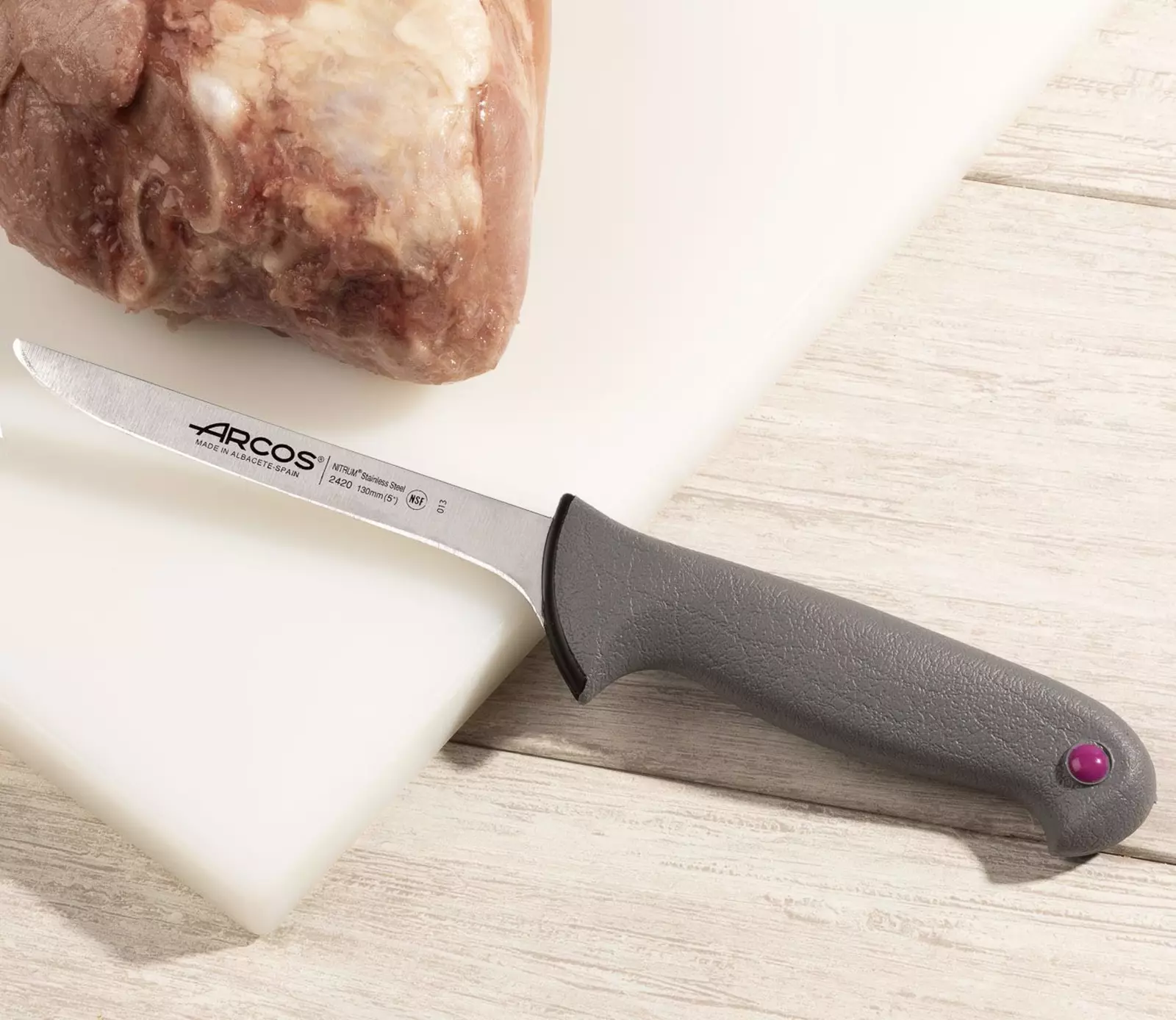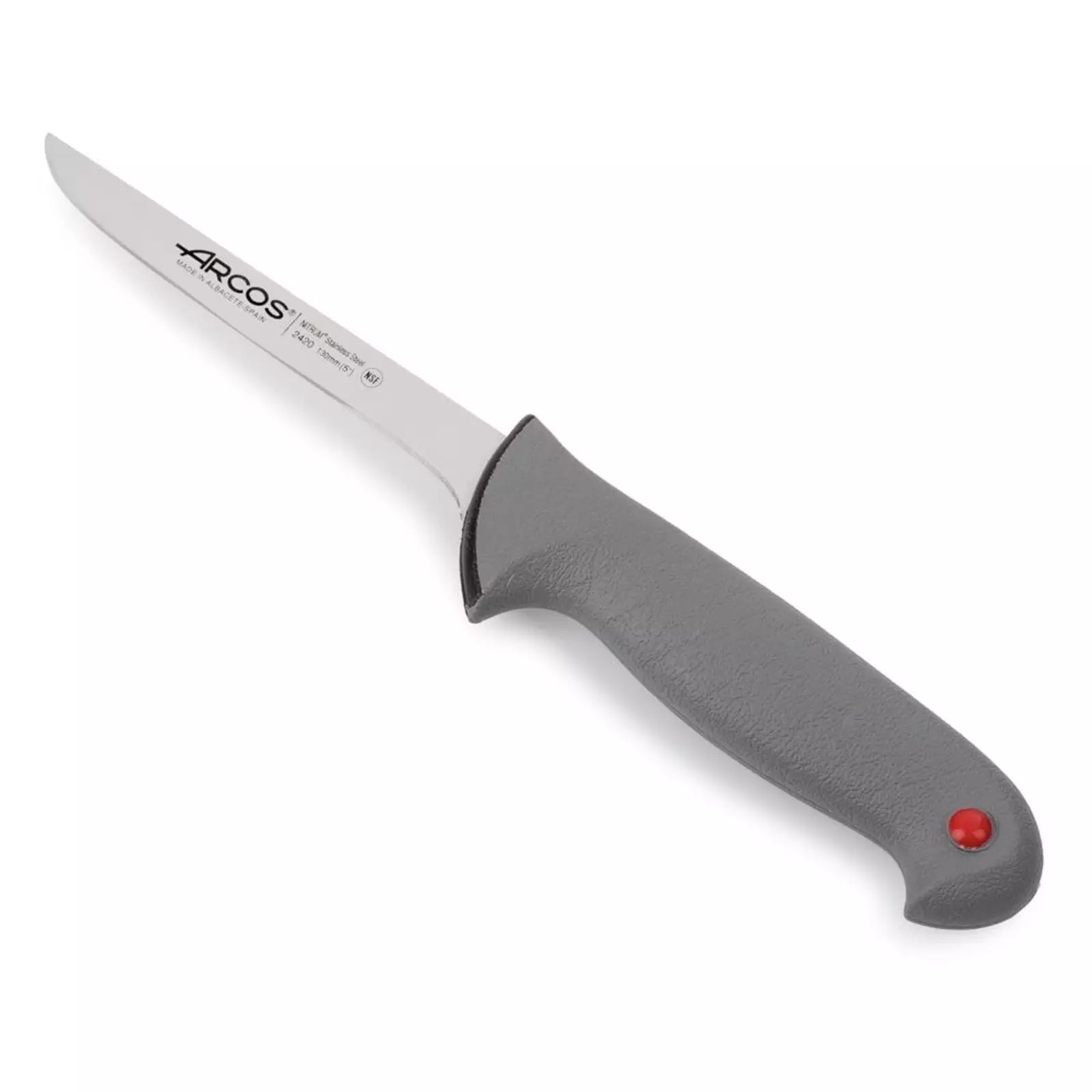 Gamme de coutellerie professionnelle HACCP « Bi-injection ». Une première injection de plastique (polypropylène) qui constitue le cœur dur du manche, suivie d’une deuxième injection d’élastomère qui apporte une prise en main agréable ainsi qu’un meilleur contrôle et une meilleure sécurité grâce à ses vertus antidérapantes. Le manche n’absorbe pas l’eau, résiste à la chaleur, aux produits lessiviels classiques et aux aliments acides. Garanti lave-vaisselle et parfaitement hygiénique.Système de clips de couleurs® pour la démarche HACCP – Lame en acier inox NITRUM® + Traitement ICE PLUS®.